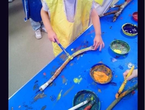 Back at nursery, the fun continued with themed activities including a “cup of tea” tuff tray, role play tea parties, collaging with wool, and even making our own walking sticks! Each child also painted a ceramic cup or plate to take home as a special gift for someone older in their family.